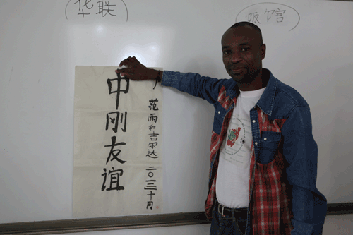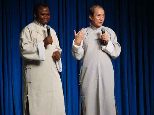 | 喀麦隆学生捷盖与丁广泉老师说相声 | 瑞士学生李牧接受丁广泉老师指导快板 |