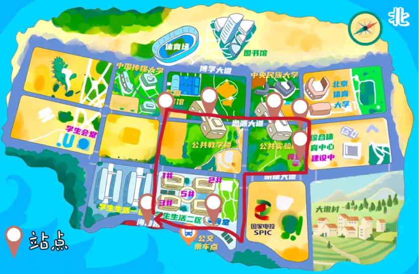 Маршрут ①: Отправление от ворот 1 жилого района 2→Через дорогу→проходя через ворота 2 → учебного корпуса Лидэ, лабораторного корпуса (на пересечении проспекта Сиюань и проспекта Цзяоронг→ эксклюзивного здания университета Минминь, эксклюзивного здания Пекинского спортивного университета→ библиотеки→ ворот 2 → ворот 1 → Чжунчуань(Источник оригинального изображения: Лон Кейю, студент Хайнаньского колледжа Глазго, Университета электронных наук и технологий Китая)