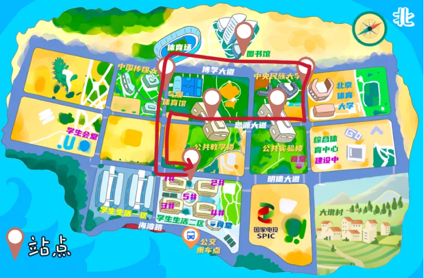 Маршрут ①: Отправление от ворот 1 жилого района 2→Через дорогу→проходя через ворота 2 → учебного корпуса Лидэ, лабораторного корпуса (на пересечении проспекта Сиюань и проспекта Цзяоронг→ эксклюзивного здания университета Минминь, эксклюзивного здания Пекинского спортивного университета→ библиотеки→ ворот 2 → ворот 1 → Чжунчуань(Источник оригинального изображения: Лон Кейю, студент Хайнаньского колледжа Глазго, Университета электронных наук и технологий Китая)