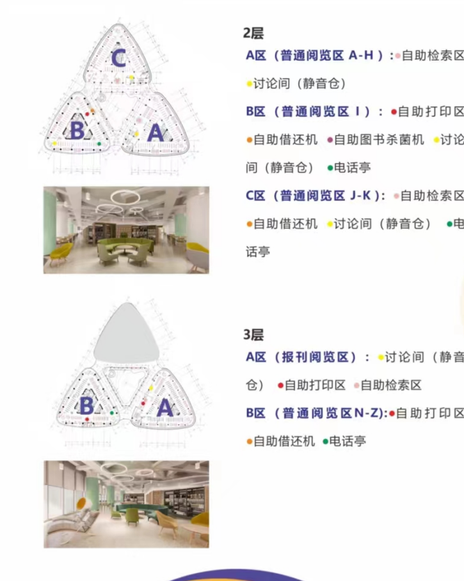 Открывающееся пространство библиотеки лианского университетского городка (Первый этап) находится с первого по третий этаж каждого блока А, В и С, общей площадью 23 000 квадратных метров и 983 местами для чтения. Среди них минус первый этаж – библиотечная зона редактирования и обработки книг, которая закрыта для читателей, а каждая зона с 1-го по 3-й этажи оборудована туалетами и кладовыми.