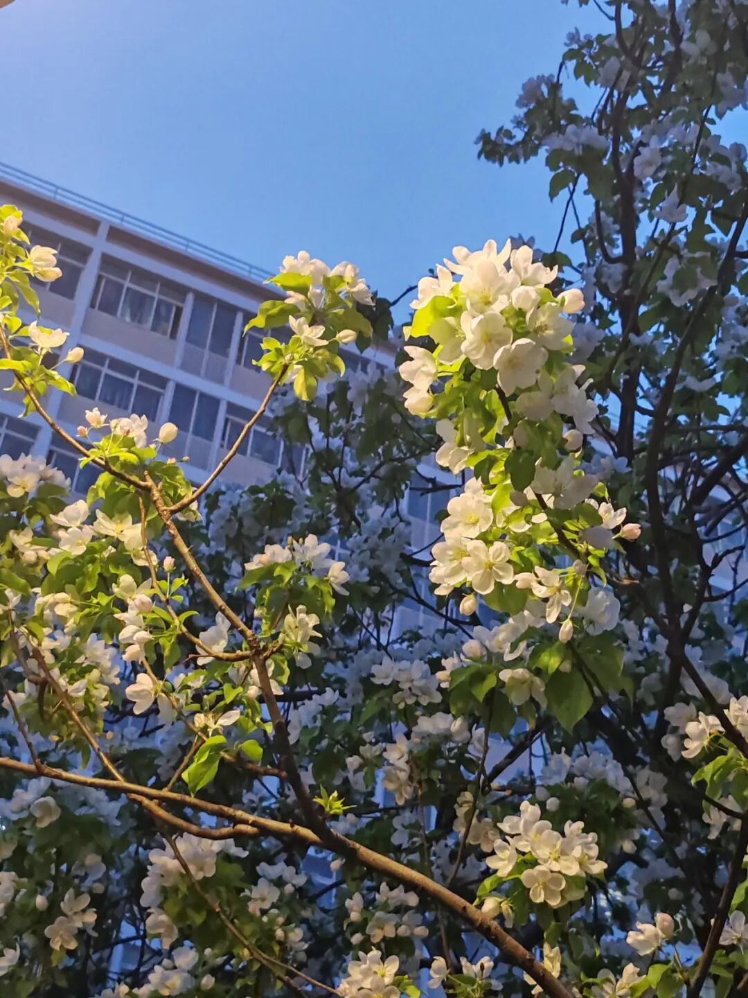 学十楼下的白色海棠花,在路灯下更显美丽洁白,