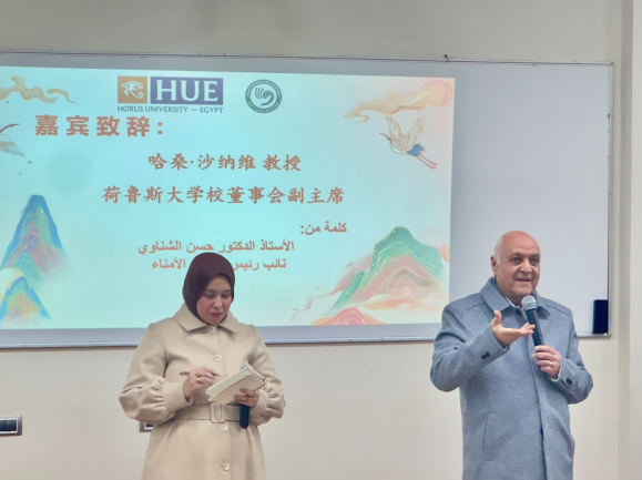 ac米兰app官方入口3月1日电(通讯员 陈奎帆 摄影 曲瓦克)埃及时间2025年2月18日,由埃及荷鲁斯大学中文系主办、苏伊士运河大学孔子学院承办的“新春庆典·中华韵味”2025中国文化日活动圆满落幕。应埃及荷鲁斯大学语言与翻译学院的邀请,苏伊士运河大学孔子学院埃方院长哈桑·拉杰布(大海)教授、中方代理院长马文博老师,以及八位中方教师出席了本次活动,并受到了埃及荷鲁斯大学董事会、校长、语言与翻译学院院长以及中文系主任的热情接待。