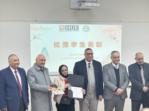 在优秀学生表彰环节,埃及荷鲁斯大学校长、语言与翻译学院院长和中文系主任高度评价了学生们的卓越表现,并依照获奖名单为学生们依次颁发证书与奖品,现场掌声雷动,气氛热烈。