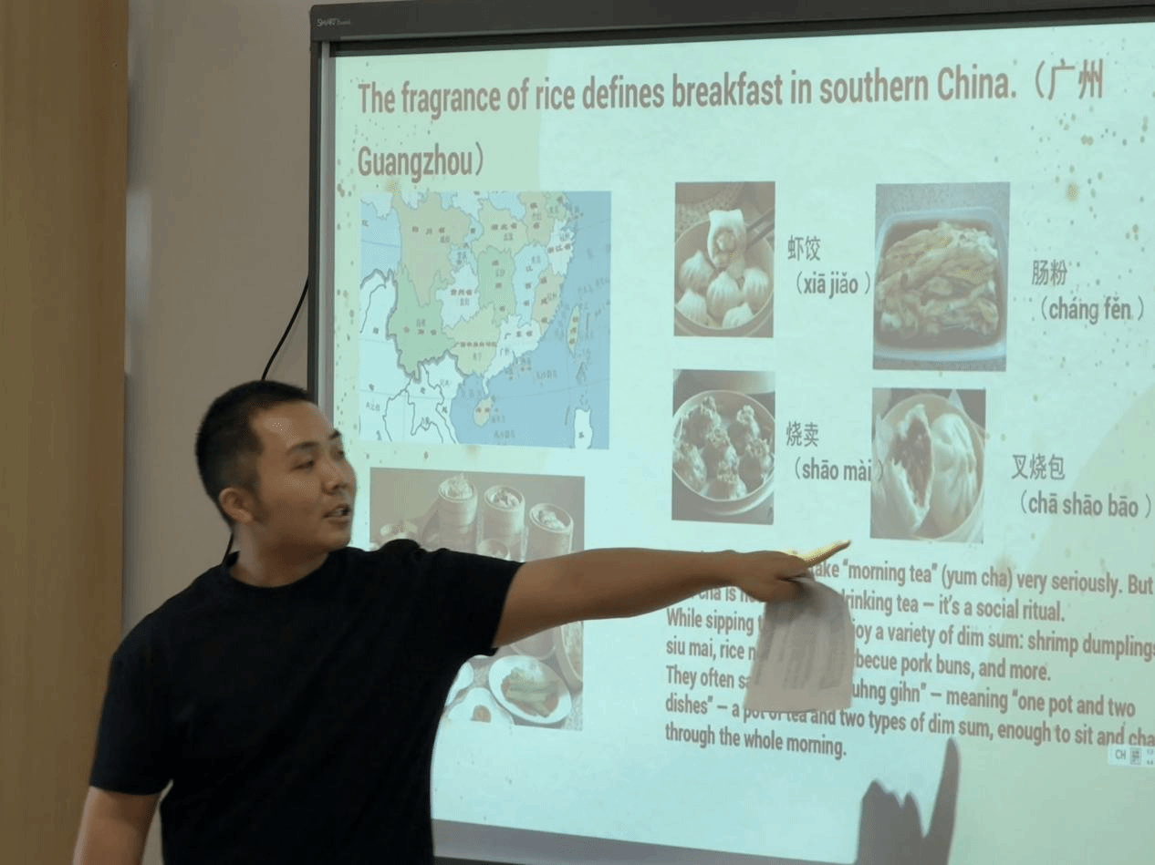 在讲解之后,进入了轻松有趣的互动环节——“找出早餐的家乡”。主持人展示多张中国各地早餐的图片,让学生猜测这些食物分别来自哪个地区。现场气氛活跃,学生们踊跃回答,不时传出阵阵笑声。在这个过程中,大家不仅复习了中文表达,还进一步了解了中国的地理与饮食文化。